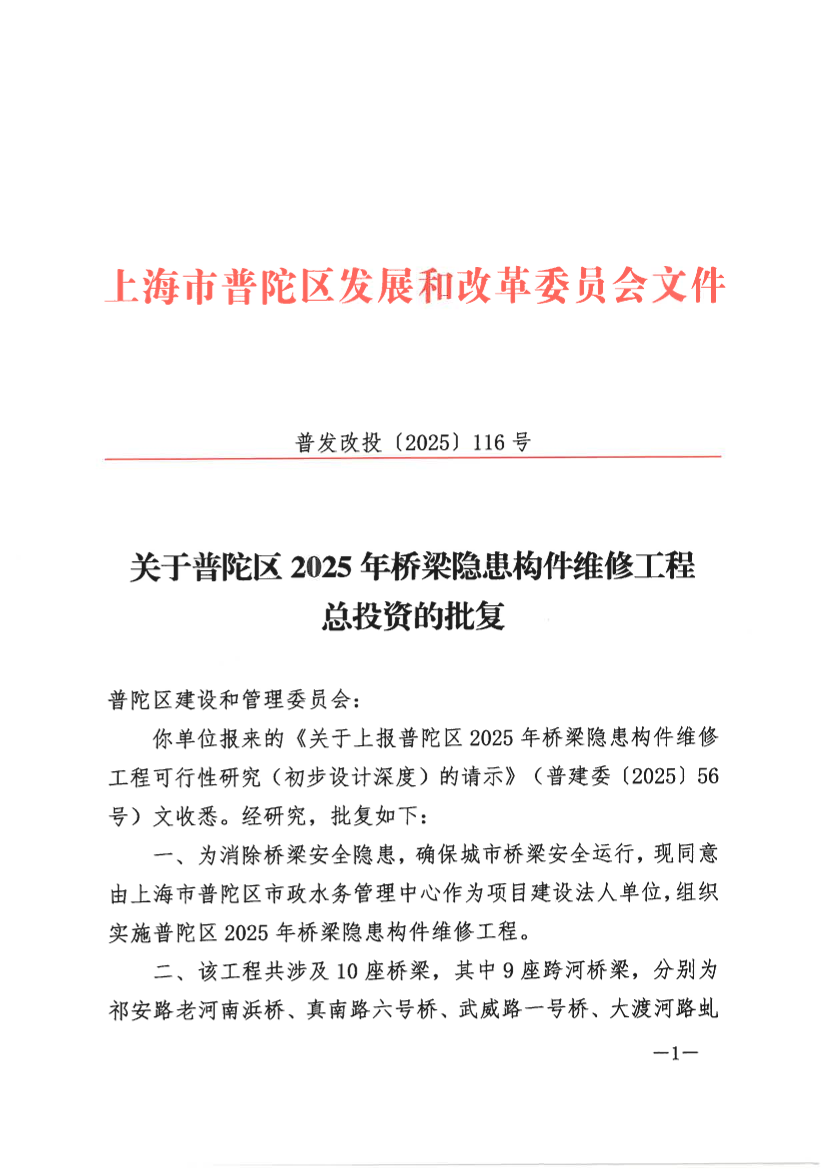 关于普陀区2025年桥梁隐患构件维修工程总投资的批复