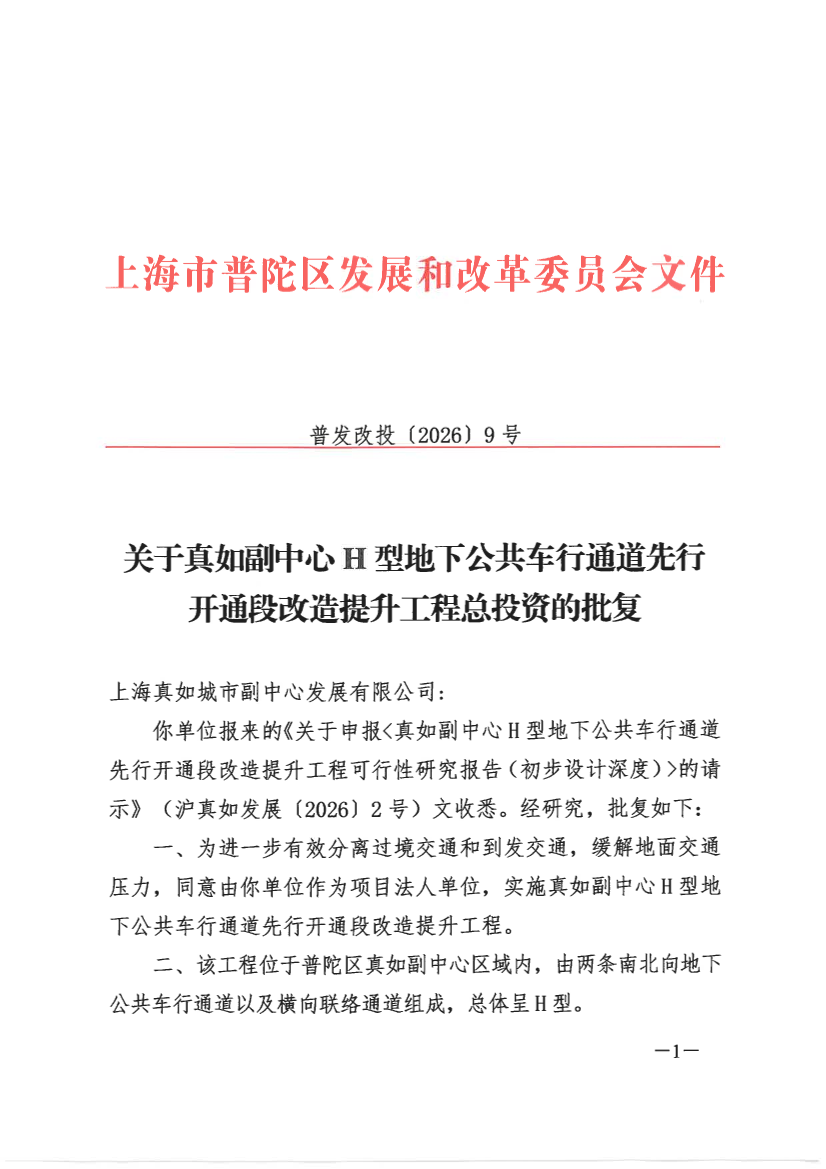 你单位报来的《关于申报<真如副中心H型地下公共车行通道先行开通段改造提升工程可行性研究报告(初步设计深度)>的请示》(沪真如发展〔2026〕2号)文收悉。经研究,批复如下: