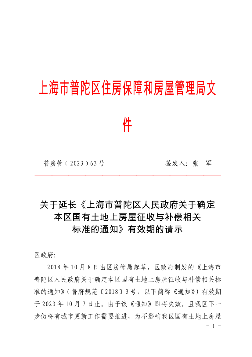 关于延长《上海市普陀区人民政府关于确定本区国有土地上房屋征收与补偿相关标准的通知》有效期的请示