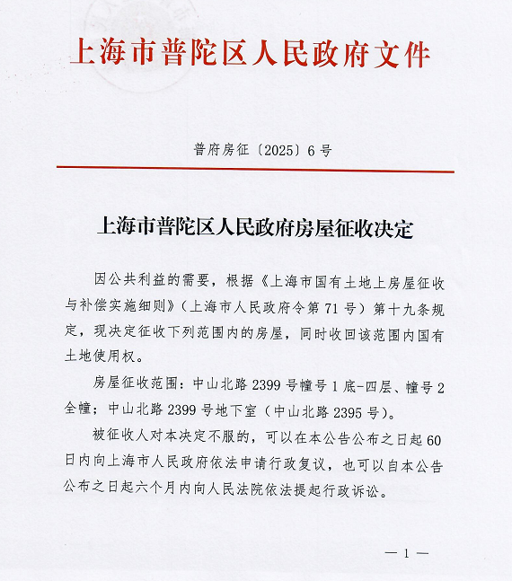 普陀区碌曲路(中山北路-堰门路)道路新建工程(橙子酒店)地块房屋征收决定