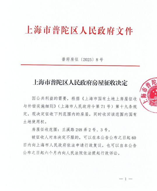 上海市普陀区人民政府房屋征收决定(普陀区兰溪路248弄2、3号地块)