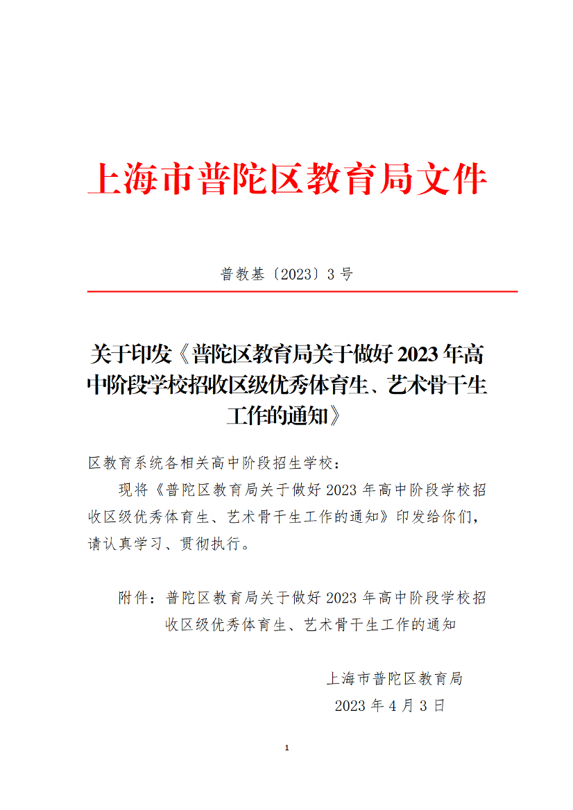 附件:普陀区教育局关于做好2023年高中阶段学校招收区级优秀体育生、艺术骨干生工作的通知