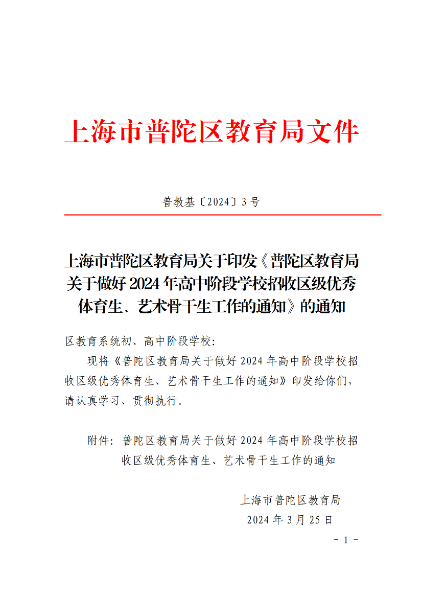 附件:普陀区教育局关于做好2024年高中阶段学校招收区级优秀体育生、艺术骨干生工作的通知