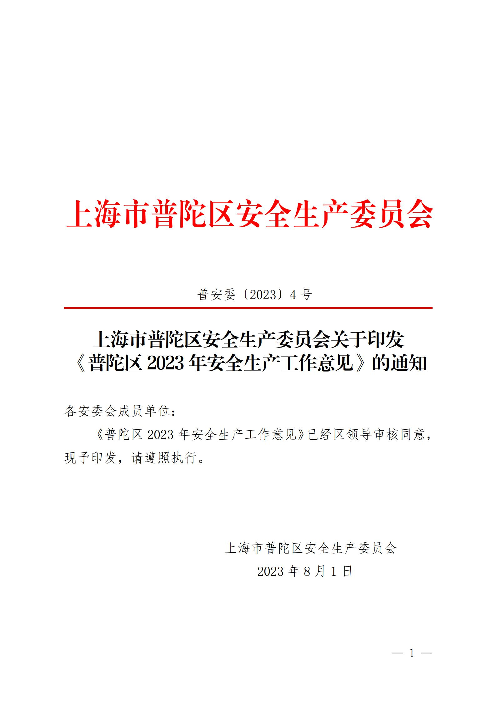 上海市普陀区安全生产委员会关于印发《普陀区2023年安全生产工作意见》的通知