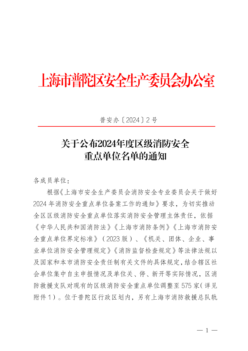 根据《上海市安全生产委员会消防安全专业委员会关于做好2024年消防安全重点单位备案工作的通知》要求,为切实推动全区区级消防安全重点单位落实消防安全管理主体责任,依据《中华人民共和国消防法》《上海市消防条例》《上海市消防安全重点单位界定标准》(2023版)、《机关、团体、企业、事业单位消防安全管理规定》《消防监督检查规定》等法律法规以及国家和本市消防安全责任制有关文件的具体规定,结合辖区社会单位集中自主申报情况及单位关、停、新开等实际情况,区消防救援支队对现有的区级消防安全重点单位调整至575家(详见附件1)。位于普陀区行政区划内,另有上海市消防救援总队轨道交通支队所辖消防重点单位10家(详见附件2)。现将2024年普陀区消防安全重点单位名单公布如下。
