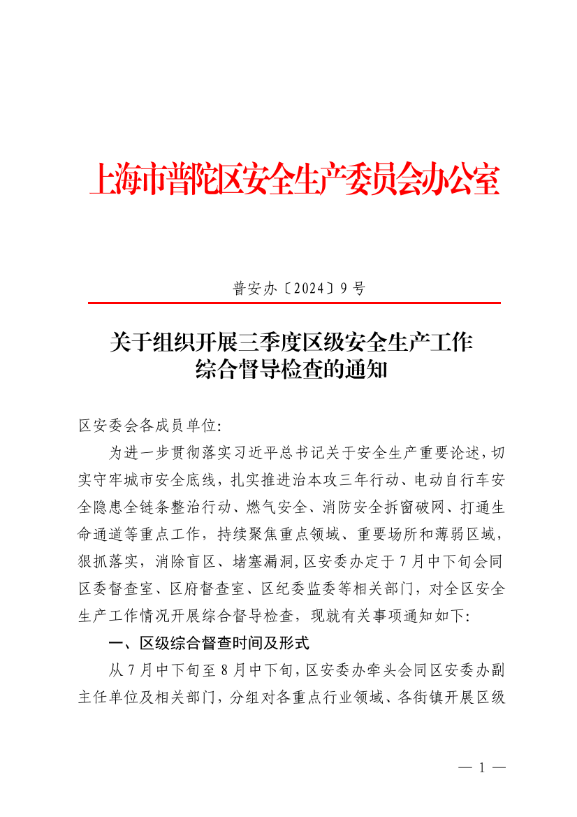 为进一步贯彻落实习近平总书记关于安全生产重要论述,切实守牢城市安全底线,扎实推进治本攻三年行动、电动自行车安全隐患全链条整治行动、燃气安全、消防安全拆窗破网、打通生命通道等重点工作,持续聚焦重点领域、重要场所和薄弱区域,狠抓落实,消除盲区、堵塞漏洞,区安委办定于7月中下旬会同区委督查室、区府督查室、区纪委监委等相关部门,对全区安全生产工作情况开展综合督导检查,现就有关事项通知如下: