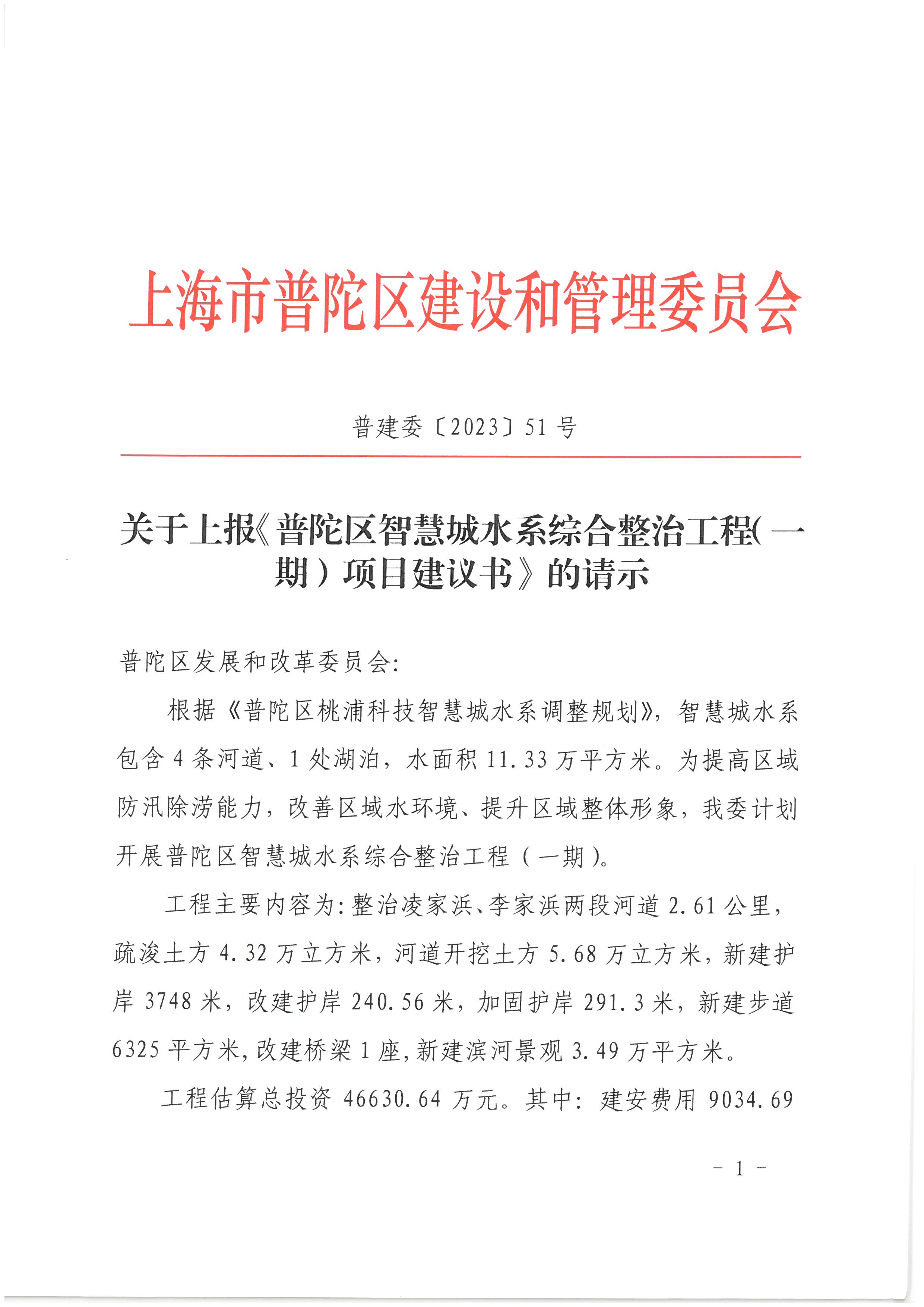 关于上报《普陀区智慧城水系综合整治工程(一期)项目建议书》的请示