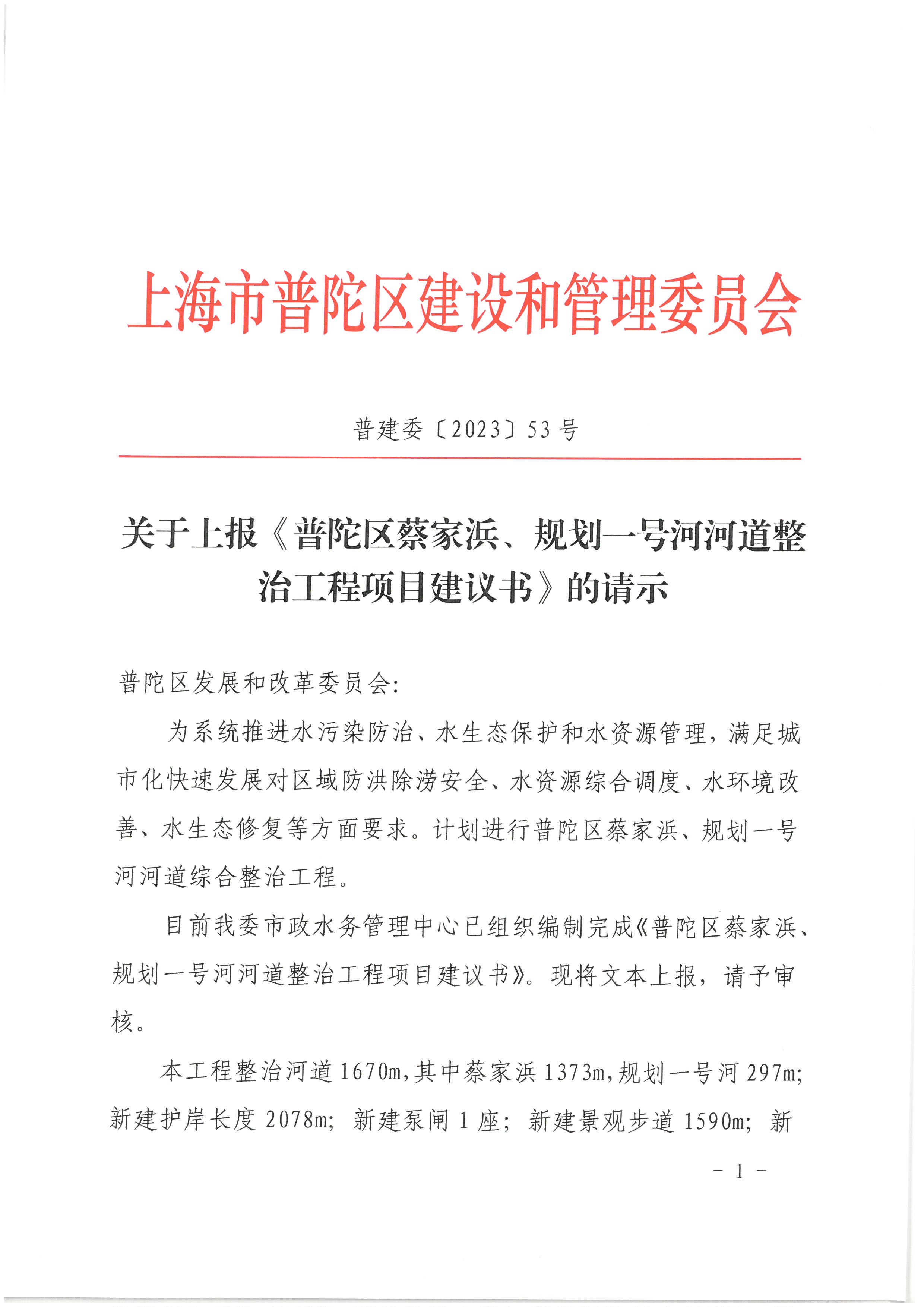 目前我委市政水务管理中心已组织编制完成《普陀区蔡家浜、规划一号河河道整治工程项目建议书》。现将文本上报,请予审核。