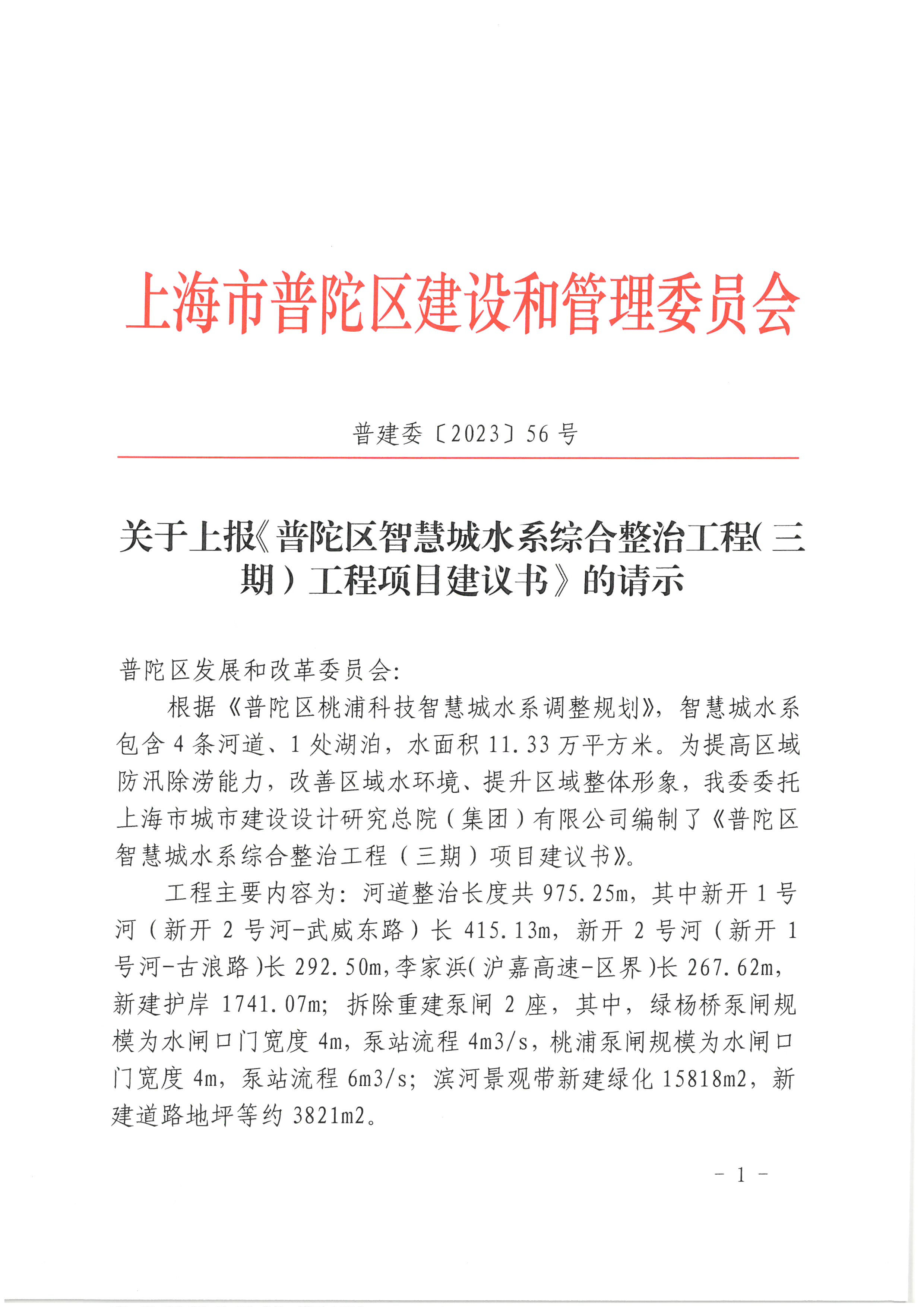 关于上报《普陀区智慧城水系综合整治工程(三期)工程项目建议书》的请示