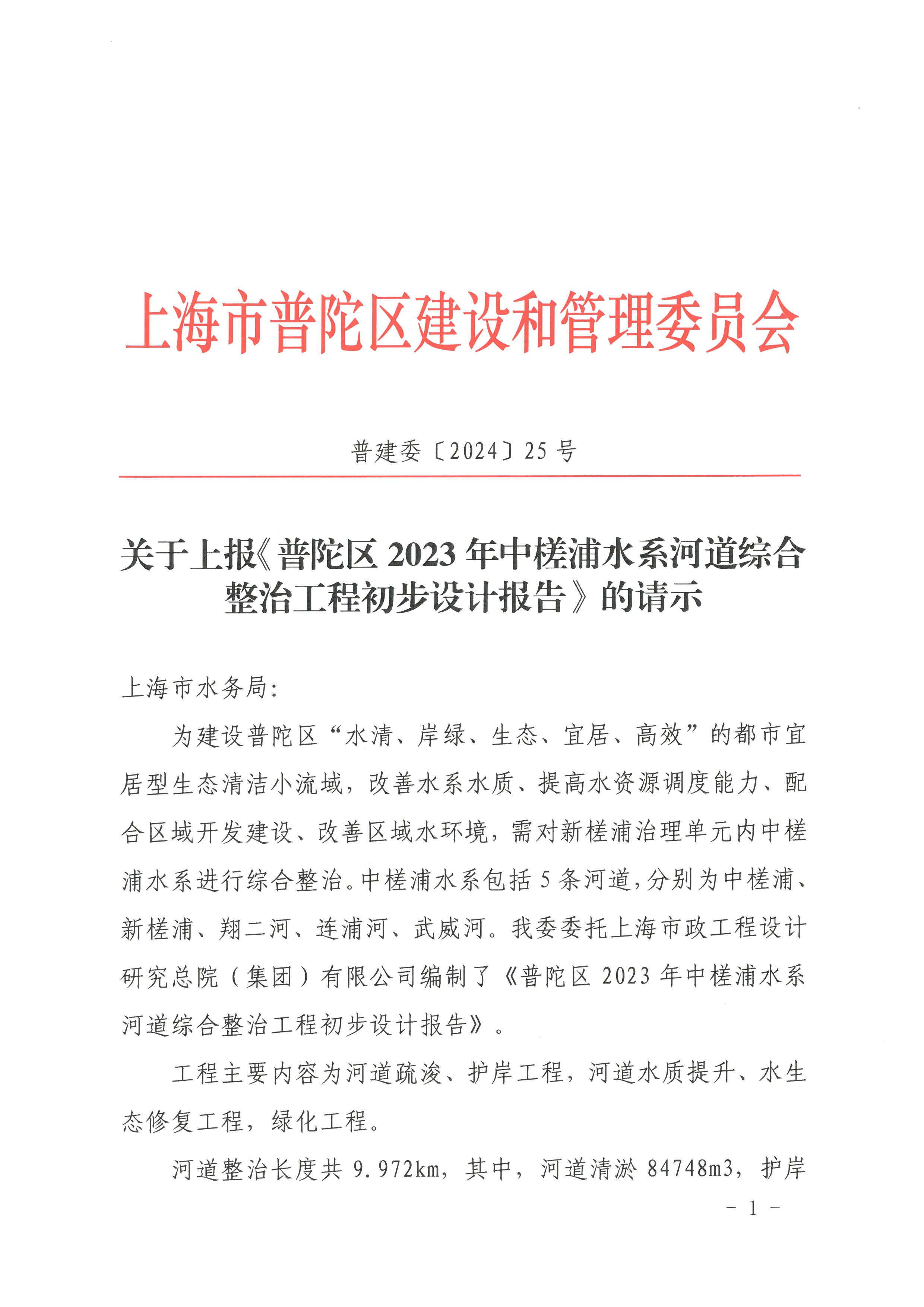关于上报《普陀区2023年中槎浦水系河道综合整治工程初步设计报告》的请示