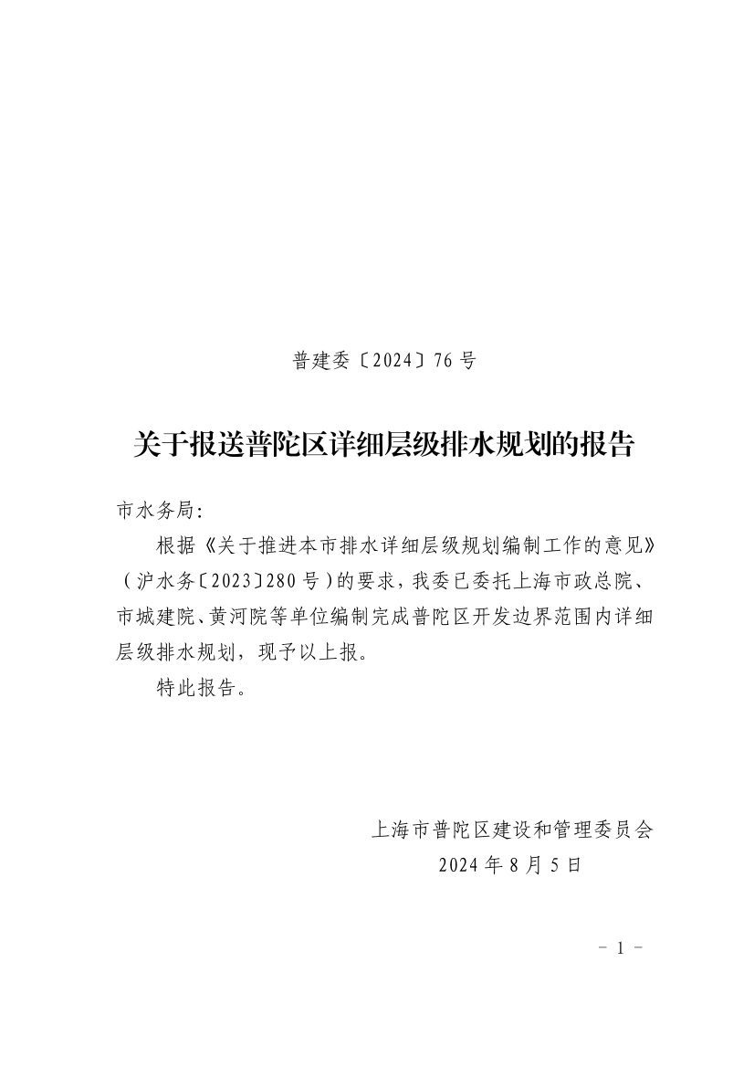 根据《关于推进本市排水详细层级规划编制工作的意见》(沪水务〔2023〕280号)的要求,我委已委托上海市政总院、市城建院、黄河院等单位编制完成普陀区开发边界范围内详细层级排水规划,现予以上报。