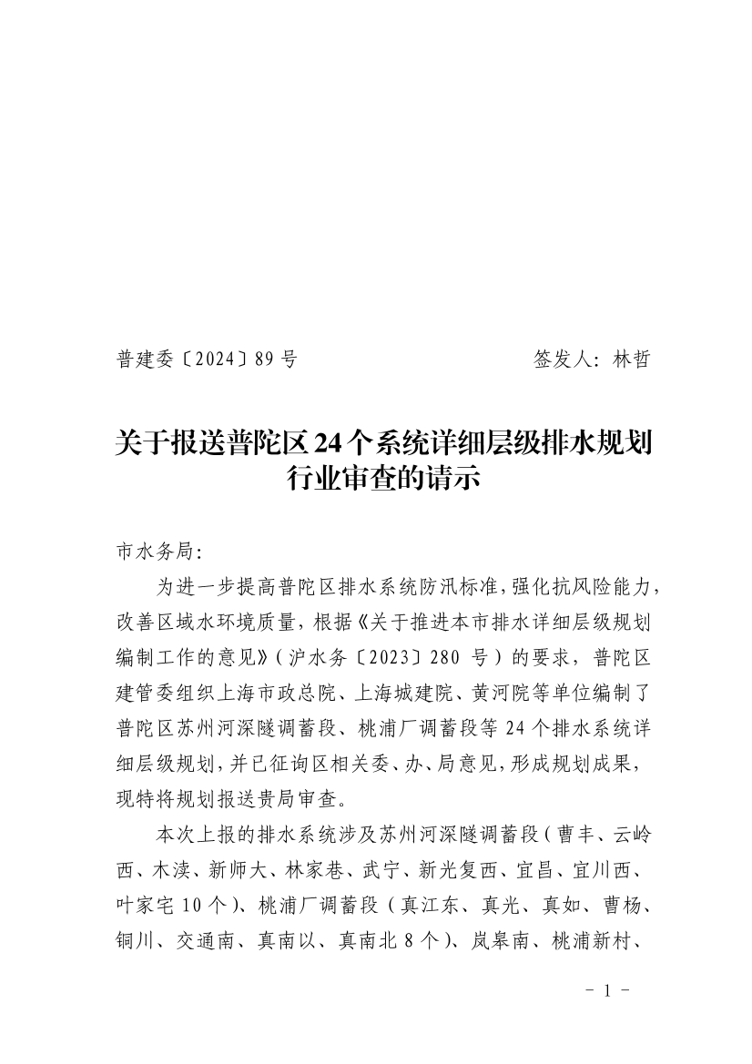 关于报送普陀区24个系统详细层级排水规划行业审查的请示
