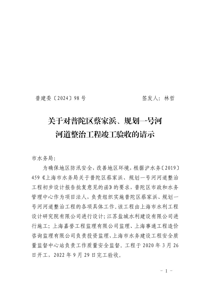 关于对普陀区蔡家浜、规划一号河河道整治工程竣工验收的请示