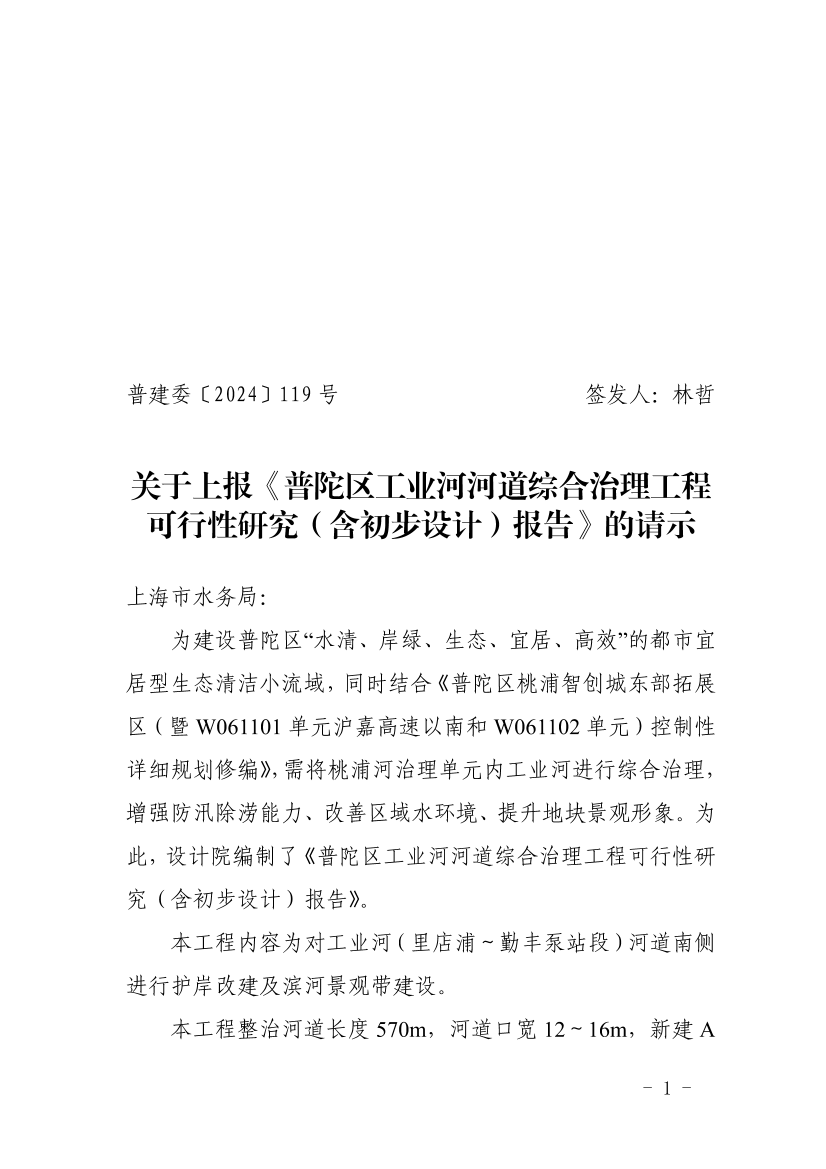 关于上报《普陀区工业河河道综合治理工程可行性研究(含初步设计)报告》的请示