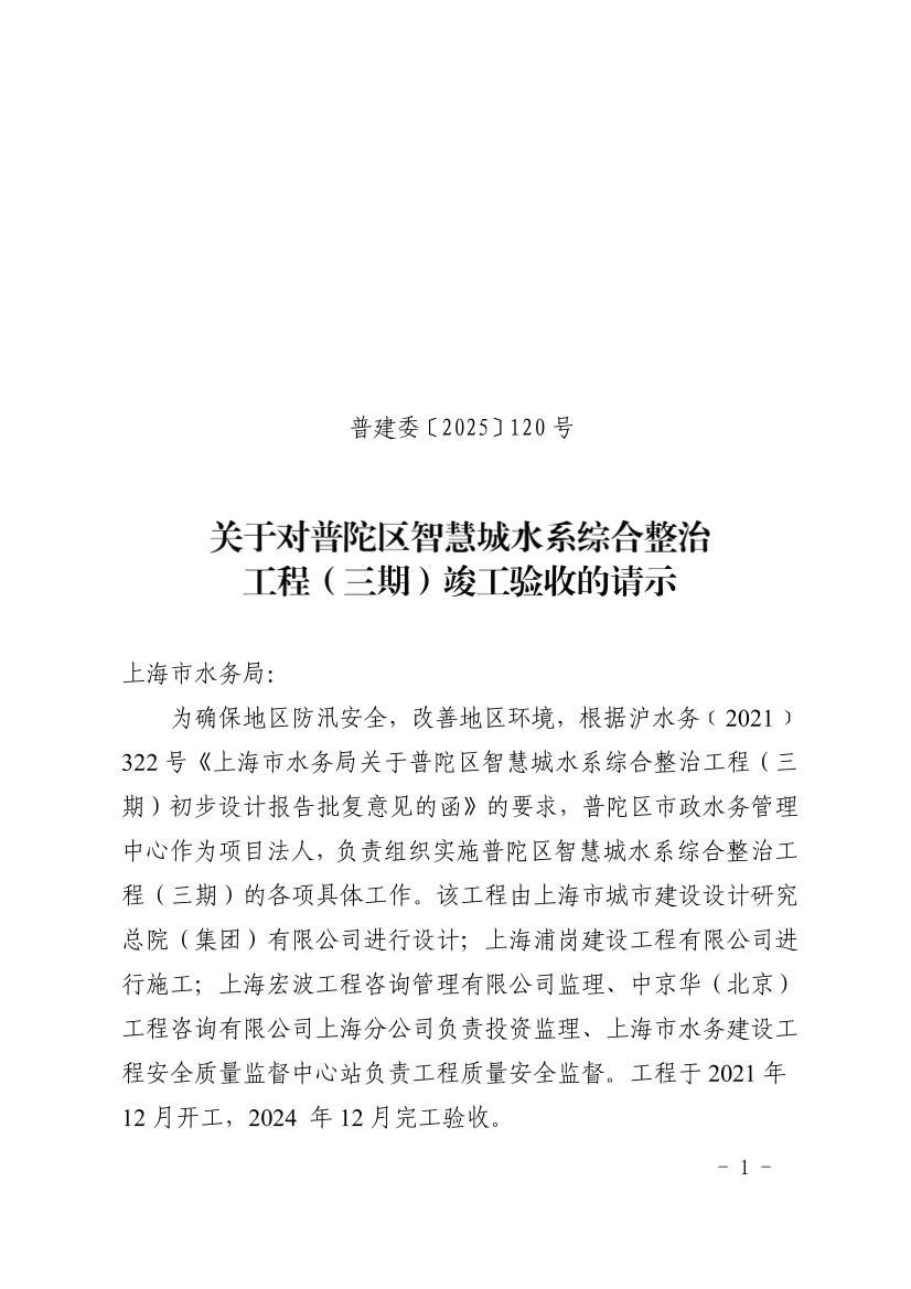 关于对普陀区智慧城水系综合整治工程(三期)竣工验收的请示