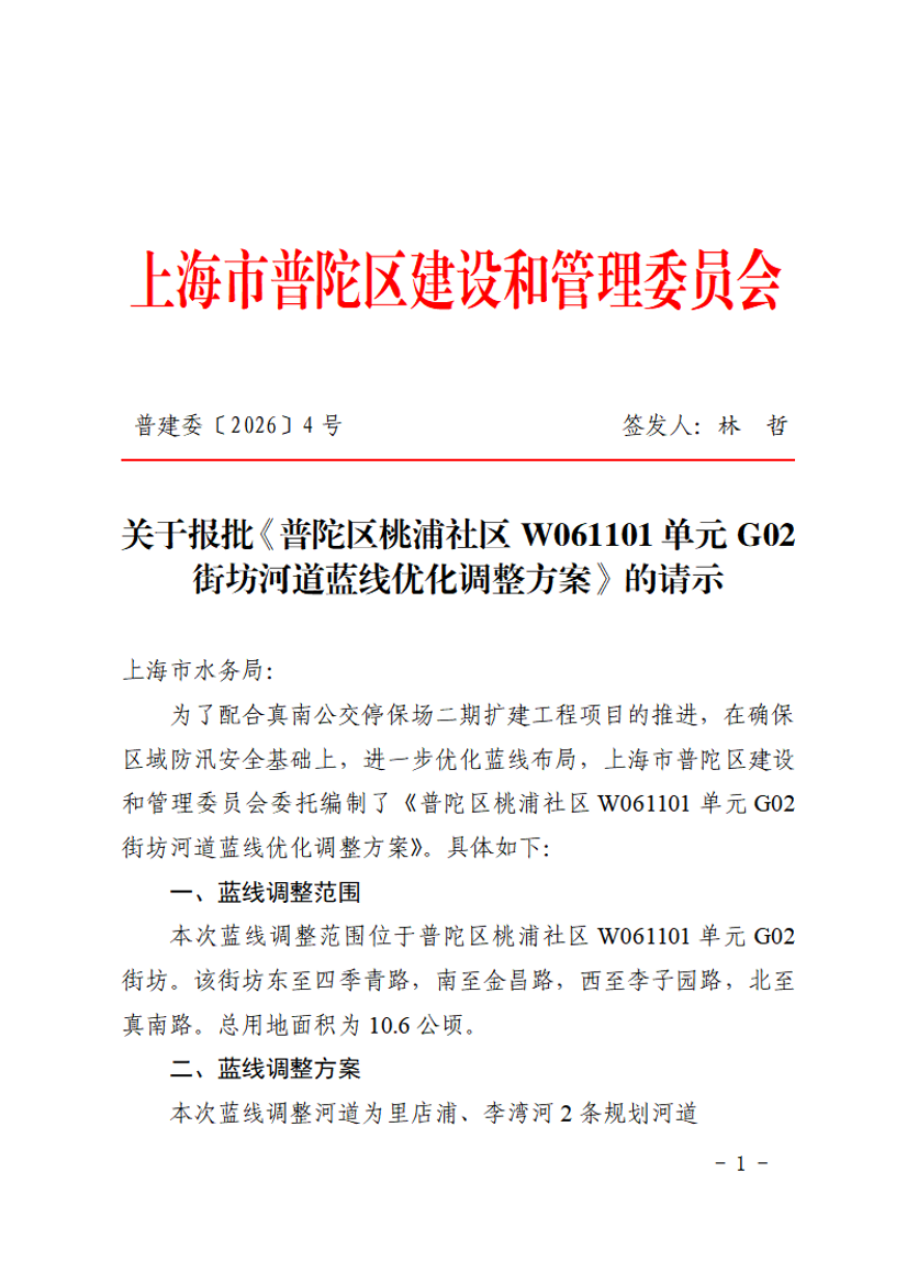 现将《普陀区桃浦社区W061101单元G02街坊河道蓝线优化调整方案》随文报上。