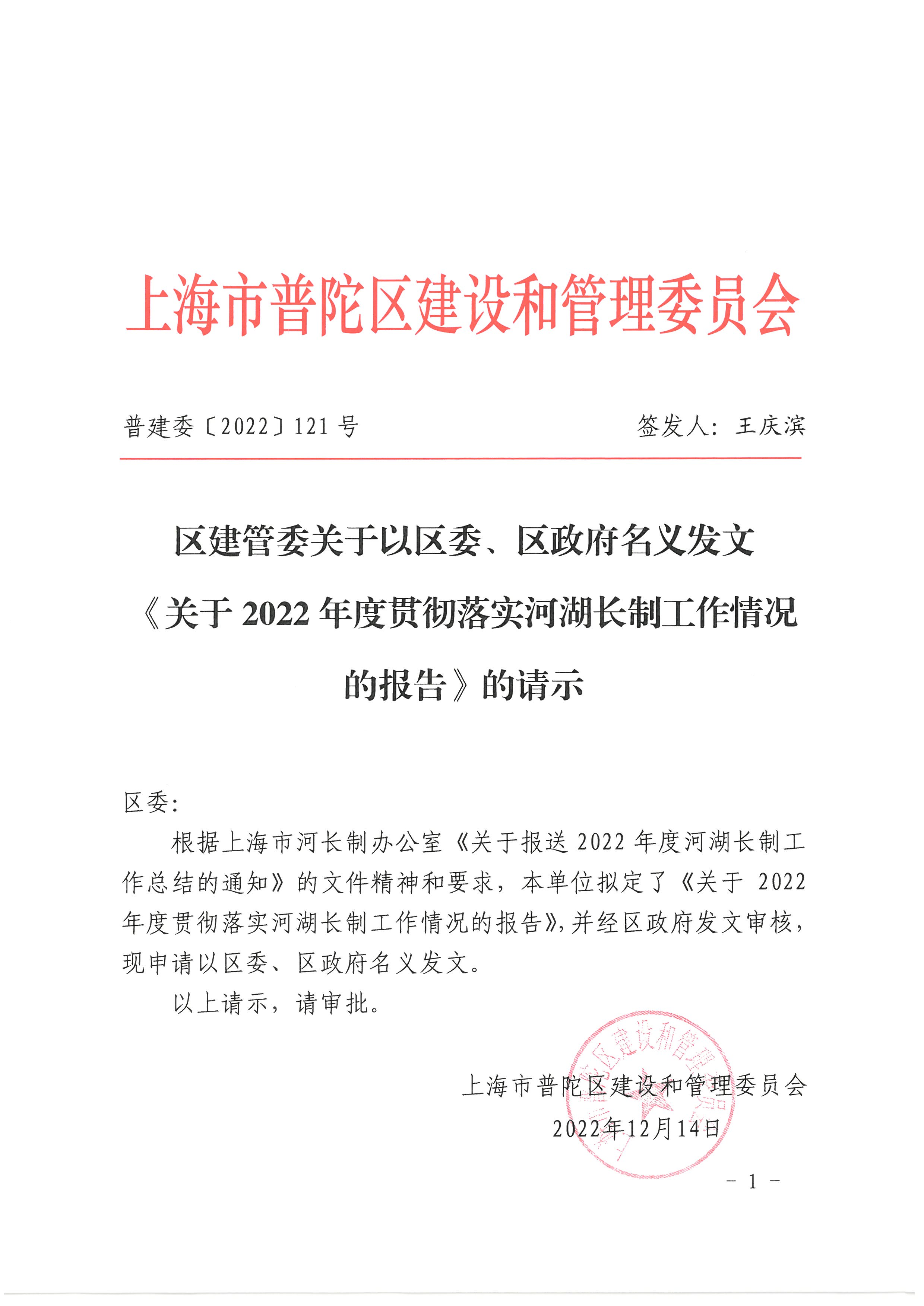 根据上海市河长制办公室《关于报送2022年度河湖长制工作总结的通知》的文件精神和要求,本单位拟定了《关于2022年度贯彻落实河湖长制工作情况的报告》,并经区政府发文审核,现申请以区委、区政府名义发文。