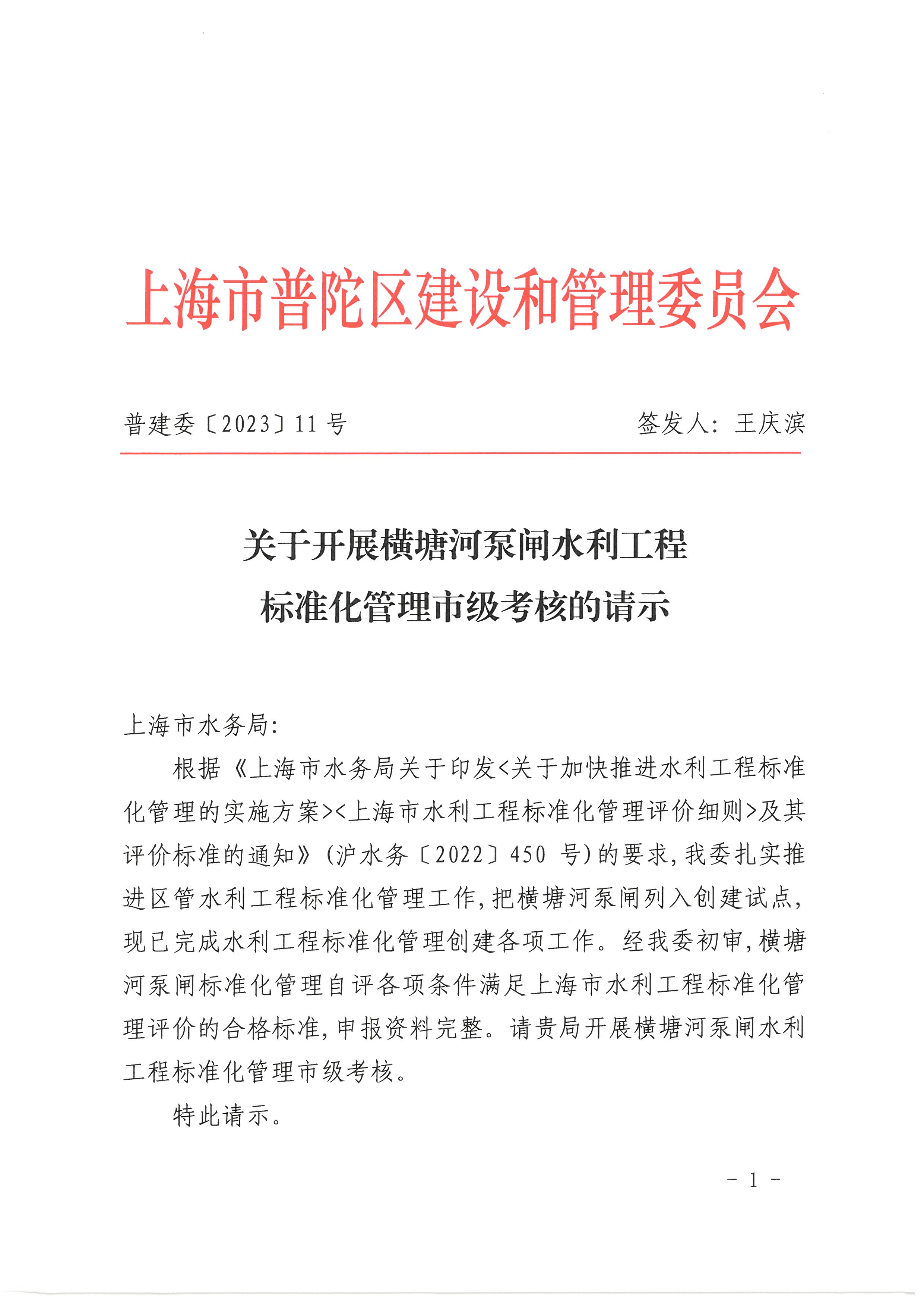 根据 《上海市水务局关于印发<关于加快推进水利工程标准化管理的实施方案><上海市水利工程标准化管理评价细则>及其评价标准的通知》(沪水务〔2022〕450号)的要求,我委扎实推进区管水利工程标准化管理工作,把横塘河泵闸列入创建试点,现已完成水利工程标准化管理创建各项工作。经我委初审,横塘河泵闸标准化管理自评各项条件满足上海市水利工程标准化管理评价的合格标准,申报资料完整。请贵局开展横塘河泵闸水利工程标准化管理市级考核。