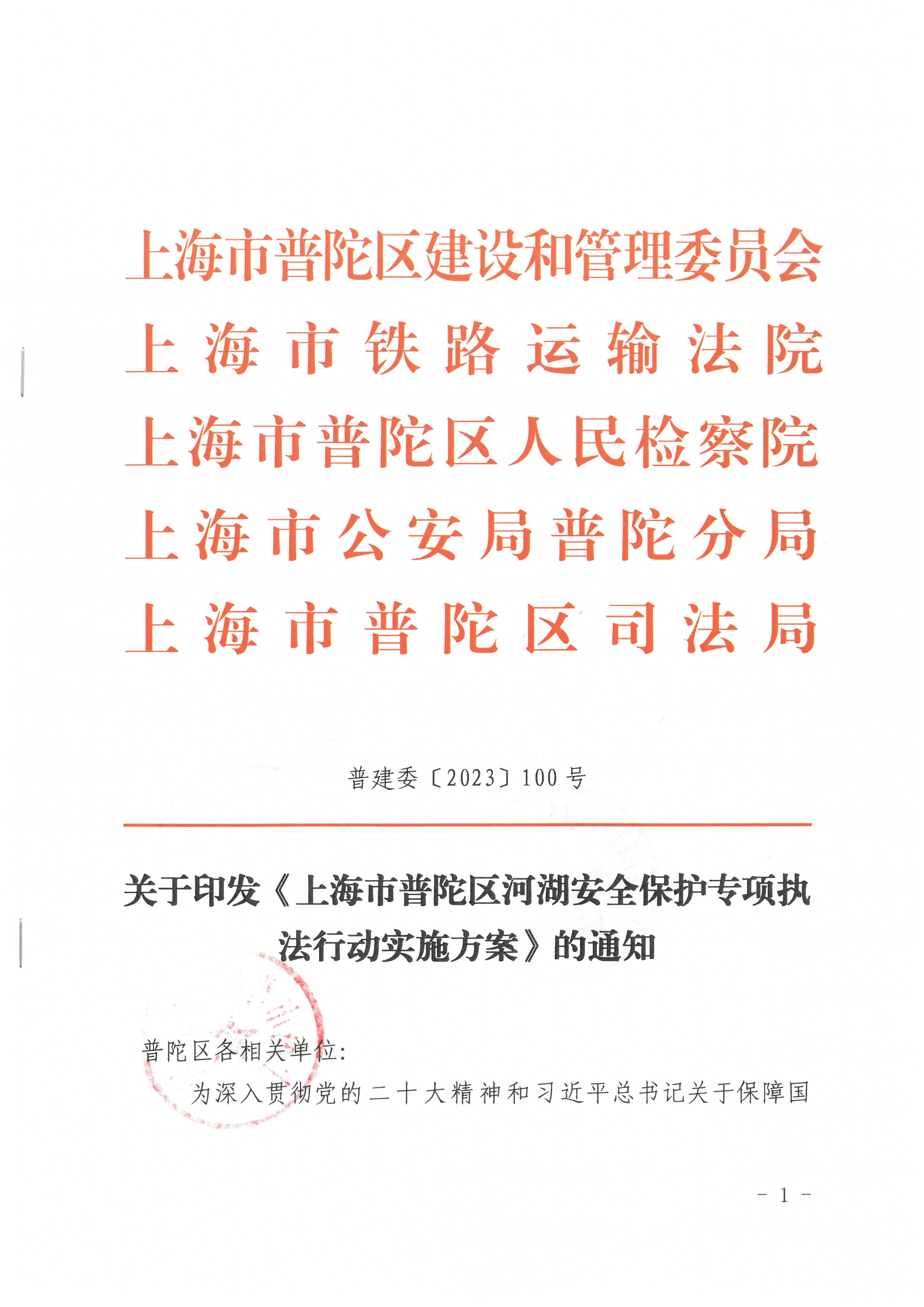 为 深入贯彻 党 的二十大精神和习近平总书记关于保障国家水安全的重要论述精神,根据《水利部办公厅 最高人民法院办公厅 最高人民检察院办公厅 公安部办公厅 司法部办公厅关于印发〈河湖安全保护专项执法行动工作方案〉的通知》(办政法〔2023〕159号)及市水务局、市高级人民法院、市人民检察院、市司法局、市公安局和长江航运公安局上海分局联合制定的《关于印发〈上海市河湖安全保护专项执法行动工作方案〉的通知》(沪水务〔2023〕464号)要求,结合普陀区实际情况,区建管委(水务局)、上铁法院、区检察院、区公安分局、区司法局共同制定了《普陀区河湖安全保护专项执法行动实施方案》,现将实施方案印发给你们,请认真贯彻执行。
