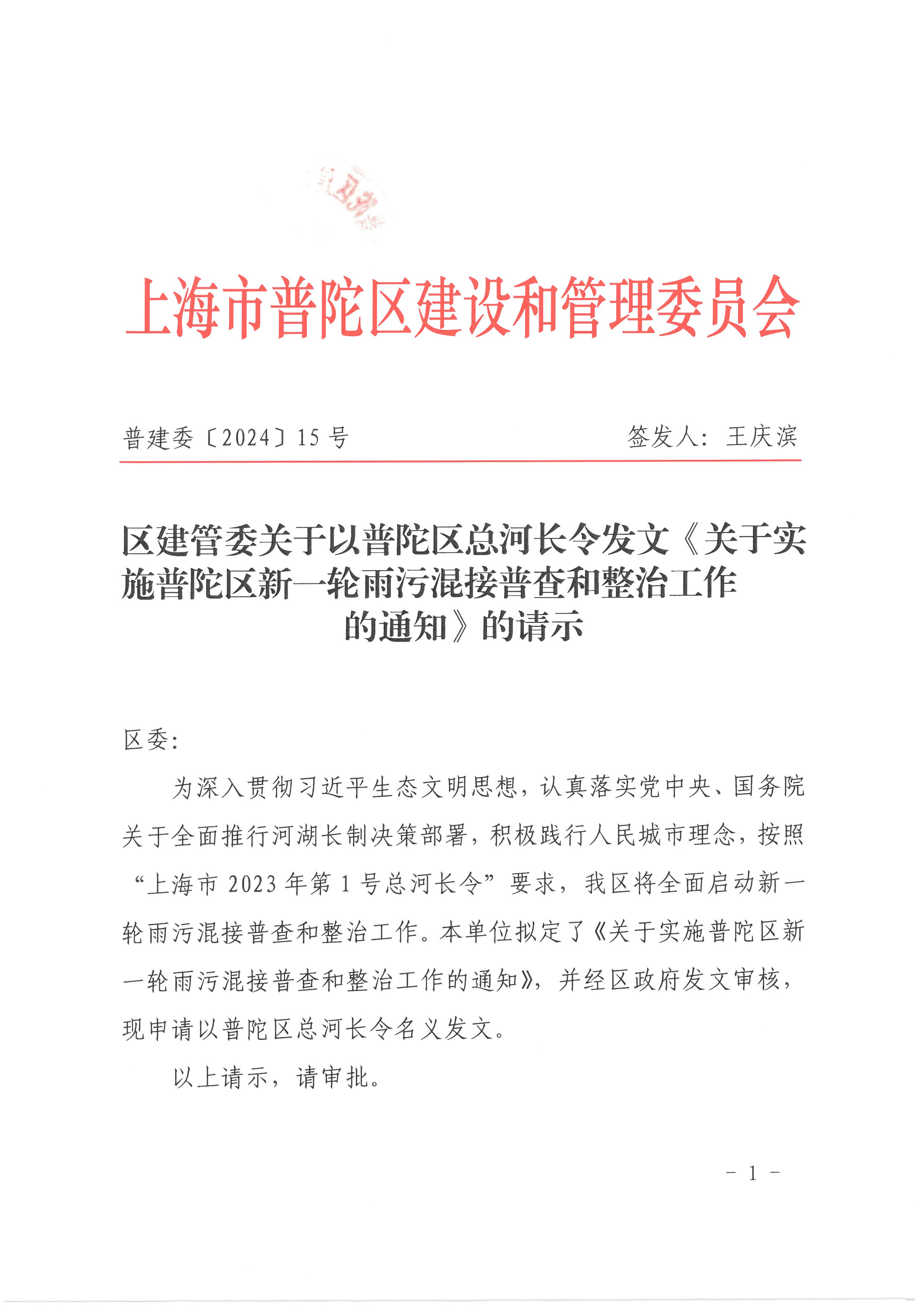 为深入贯彻习近平生态文明思想,认真落实党中央、国务院关于全面推行河湖长制决策部署,积极践行人民城市理念,按照“上海市2023年第1号总河长令”要求,我区将全面启动新一轮雨污混接普查和整治工作。本单位拟定了《关于实施普陀区新一轮雨污混接普查和整治工作的通知》,并经区政府发文审核,现申请以普陀区总河长令名义发文。