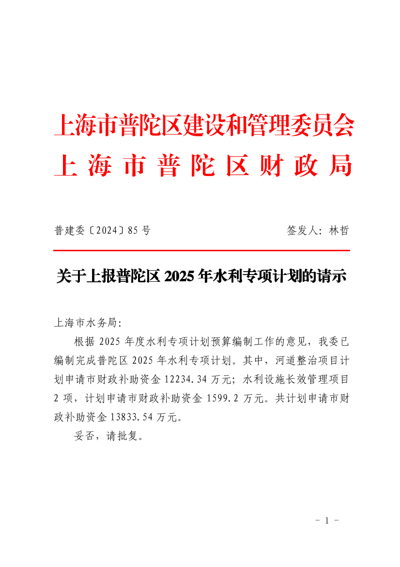 根据2025年度水利专项计划预算编制工作的意见,我委已编制完成普陀区2025年水利专项计划。其中,河道整治项目计划申请市财政补助资金12234.34万元;水利设施长效管理项目2项,计划申请市财政补助资金1599.2万元。共计划申请市财政补助资金13833.54万元。