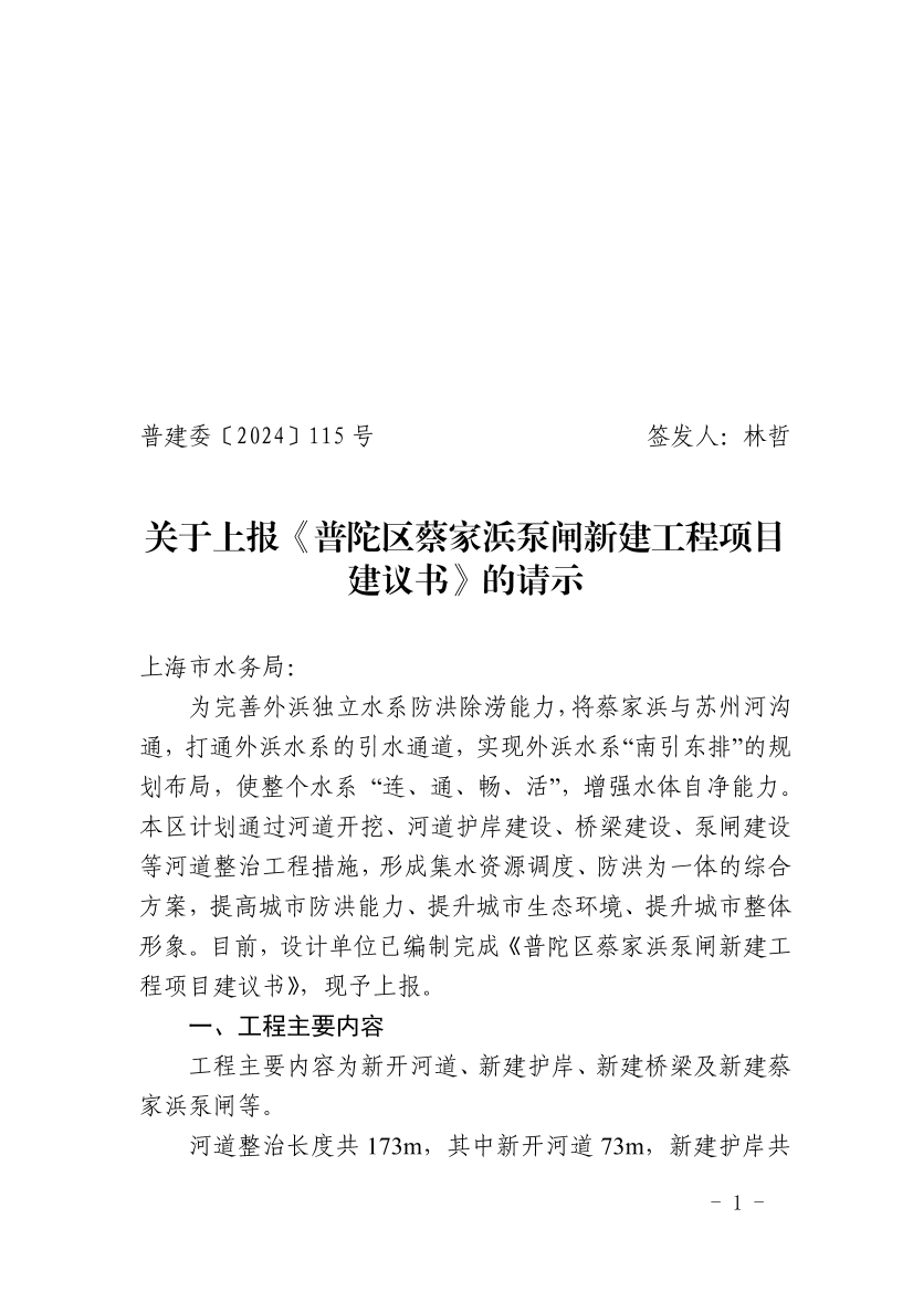 关于上报《普陀区蔡家浜泵闸新建工程项目建议书》的请示
