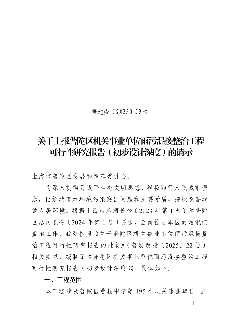 为深入贯彻习近平生态文明思想,积极践行人民城市理念,化解城市水环境污染突出问题和主要矛盾,持续改善城镇人居环境。根据上海市总河长令〔2023年第1号〕和普陀区总河长令〔2024年第1号〕要求,全面推进本区雨污混接整治工作,我委按照《关于普陀区机关事业单位雨污混接整治工程可行性研究报告的批复》(普发改投〔2025〕22号)相关要求,编制了《普陀区机关事业单位雨污混接整治工程可行性研究报告(初步设计深度)》,具体如下: