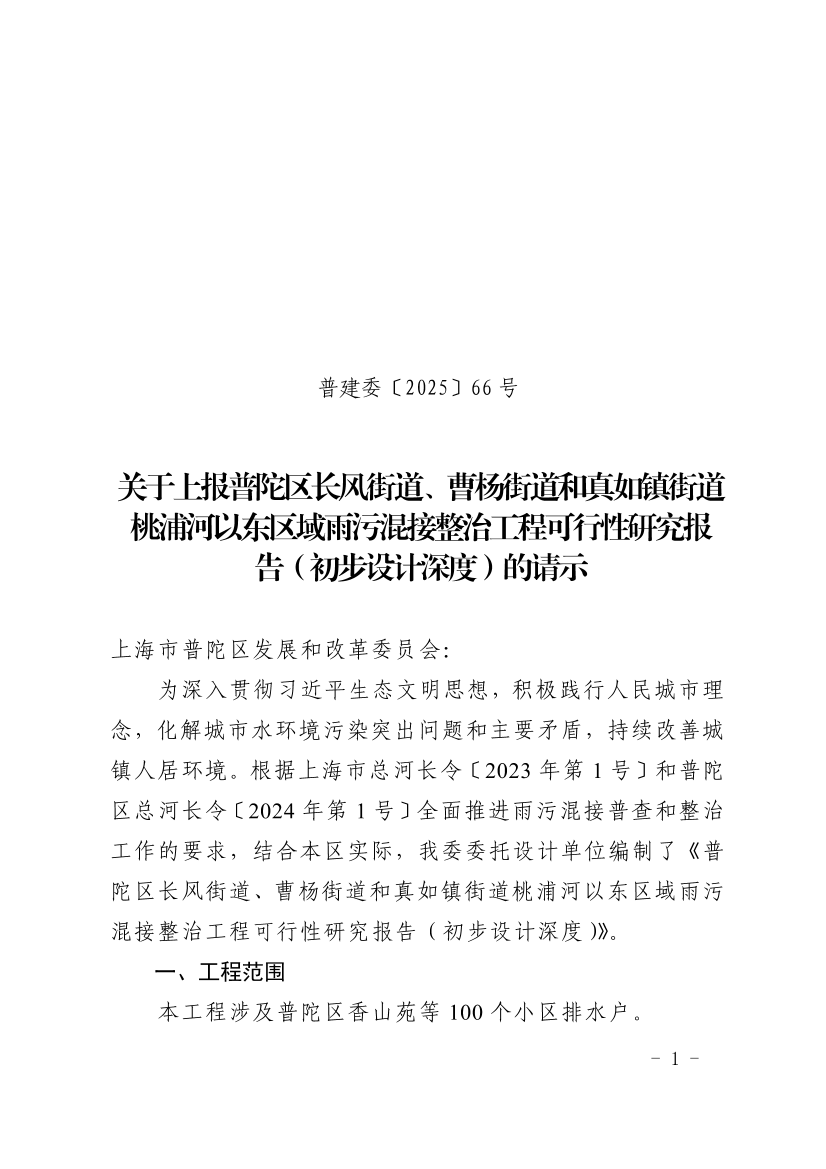 关于上报普陀区长风街道、曹杨街道和真如镇街道桃浦河以东区域雨污混接整治工程可行性研究报告(初步设计深度)的请示