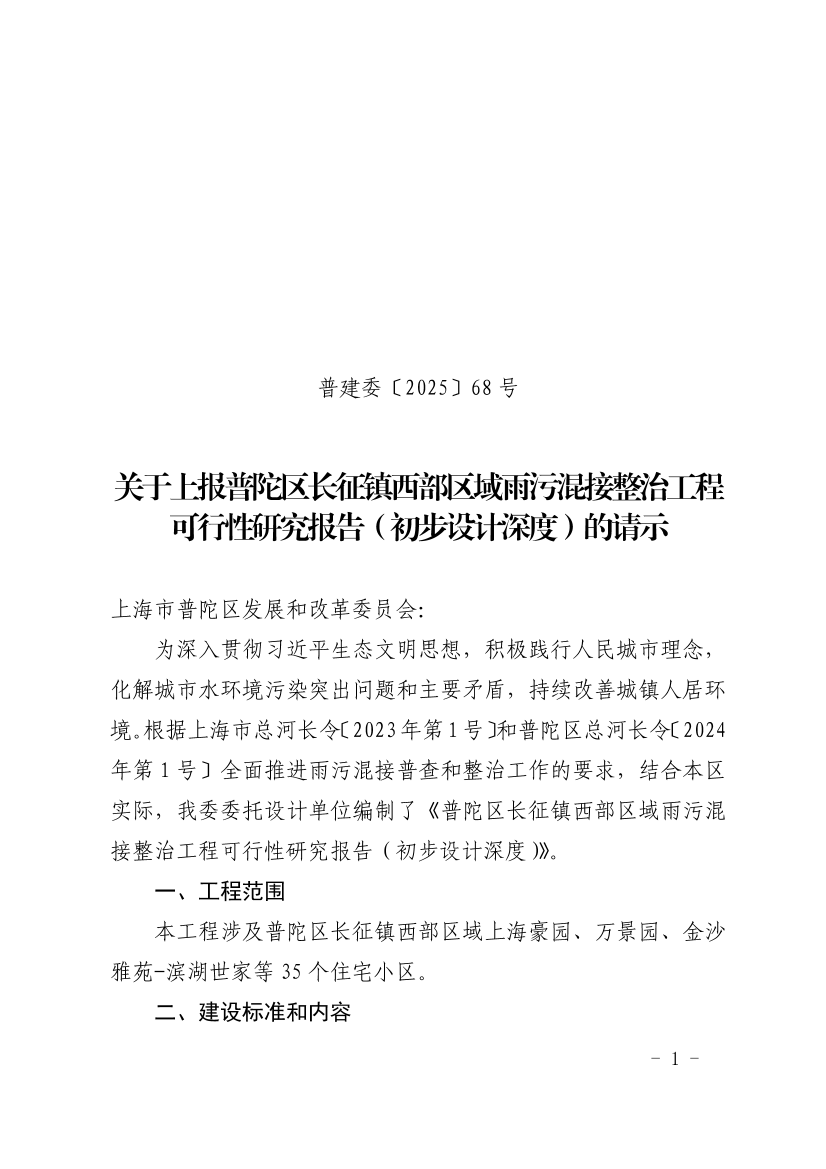 关于上报普陀区长征镇西部区域雨污混接整治工程可行性研究报告(初步设计深度)的请示