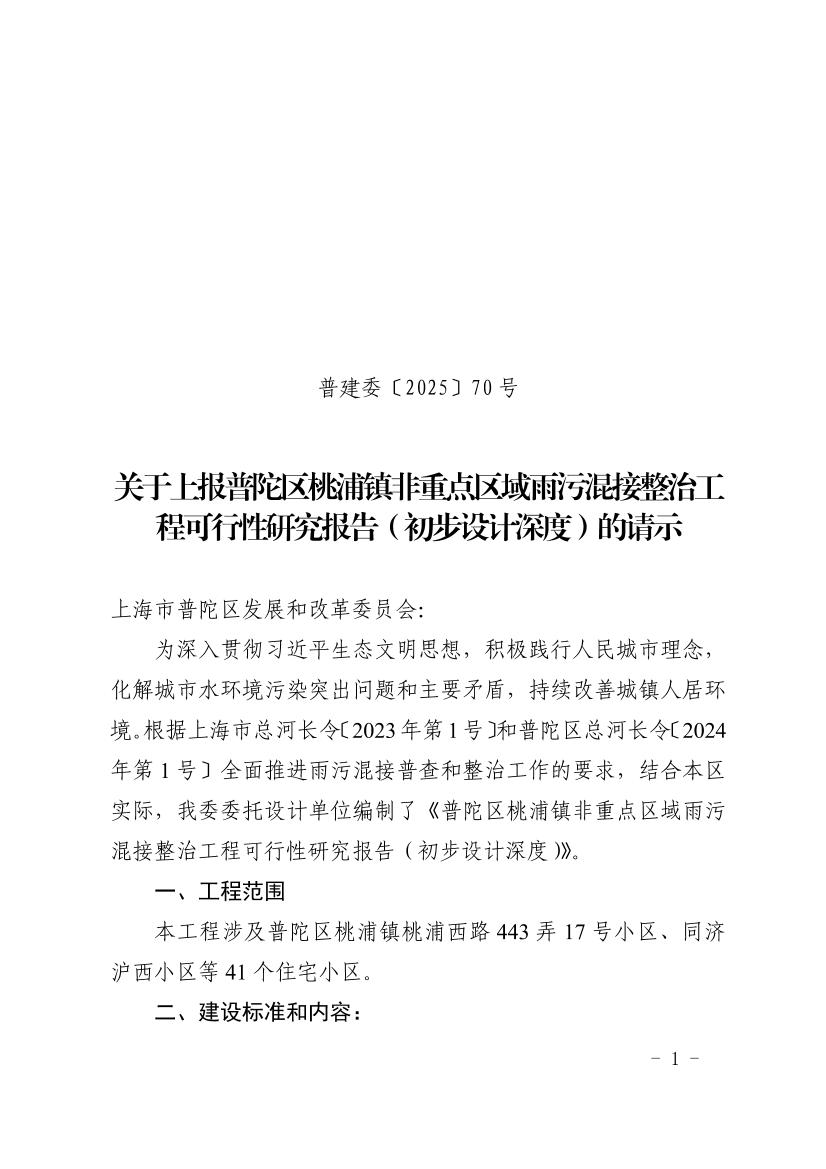 关于上报普陀区桃浦镇非重点区域雨污混接整治工程可行性研究报告(初步设计深度)的请示