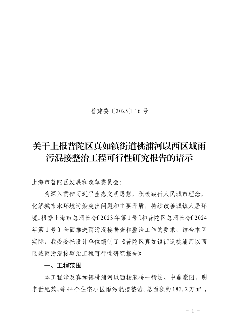 关于上报普陀区真如镇街道桃浦河以西区域雨污混接整治工程可行性研究报告的请示