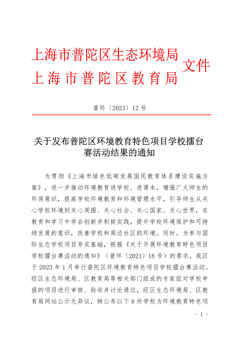 为贯彻《上海市绿色低碳发展国民教育体系建设实施方案》,进一步推动环境教育进学校、进课本,增强广大师生的环保意识,提高学校环境教育和环境管理水平,引导师生从关心学校环境到关心周围、关心社会、关心国家、关心世界,在教育和学习中学会创新并积极实践,提升学校环境保护和可持续发展的意识,改善学校和周边社区的环境。同时,为参与国际生态学校项目夯实基础,根据《关于开展环境教育特色项目学校擂台赛活动的通知》(普环〔2021〕18号)的要求,我区于2023年1月举行普陀区环境教育特色项目学校擂台赛活动。经区生态环境局、区教育局等相关部门组成的专家组对学校申报的项目进行审核、验收并讨论通过,经区生态环境局、区教育局网站公示无异议,特公布以下8所学校为环境教育特色项目学校(排名不分先后):