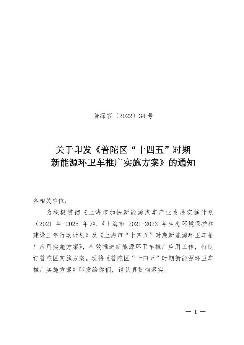 关于印发《普陀区“十四五”时期新能源环卫车推广实施方案》的通知