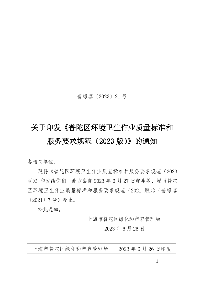 关于印发《普陀区环境卫生作业质量标准和服务要求规范(2023版)》的通知