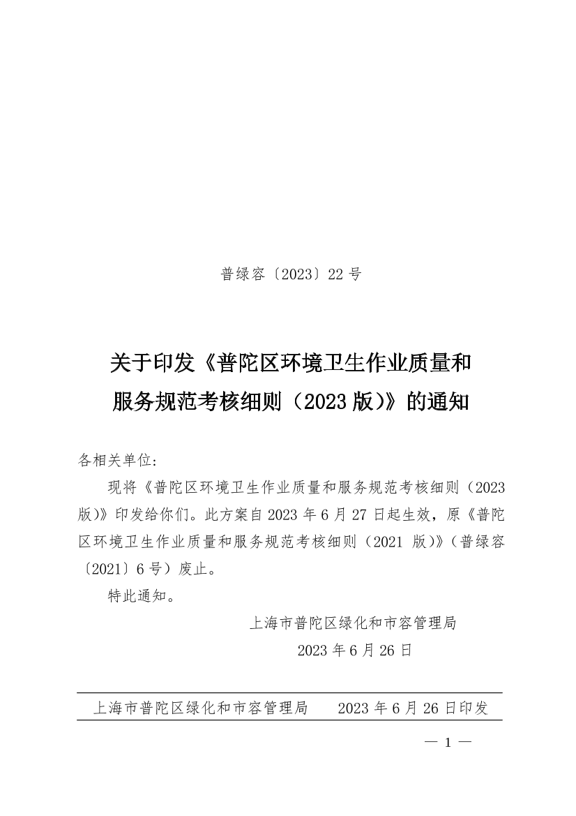 关于印发《普陀区环境卫生作业质量和服务规范考核细则(2023版)》的通知
