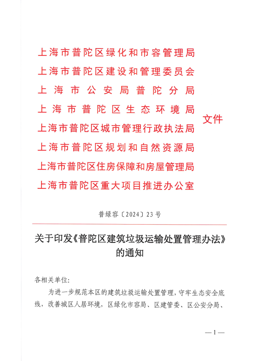 关于印发《普陀区建筑垃圾运输处置管理办法》的通知