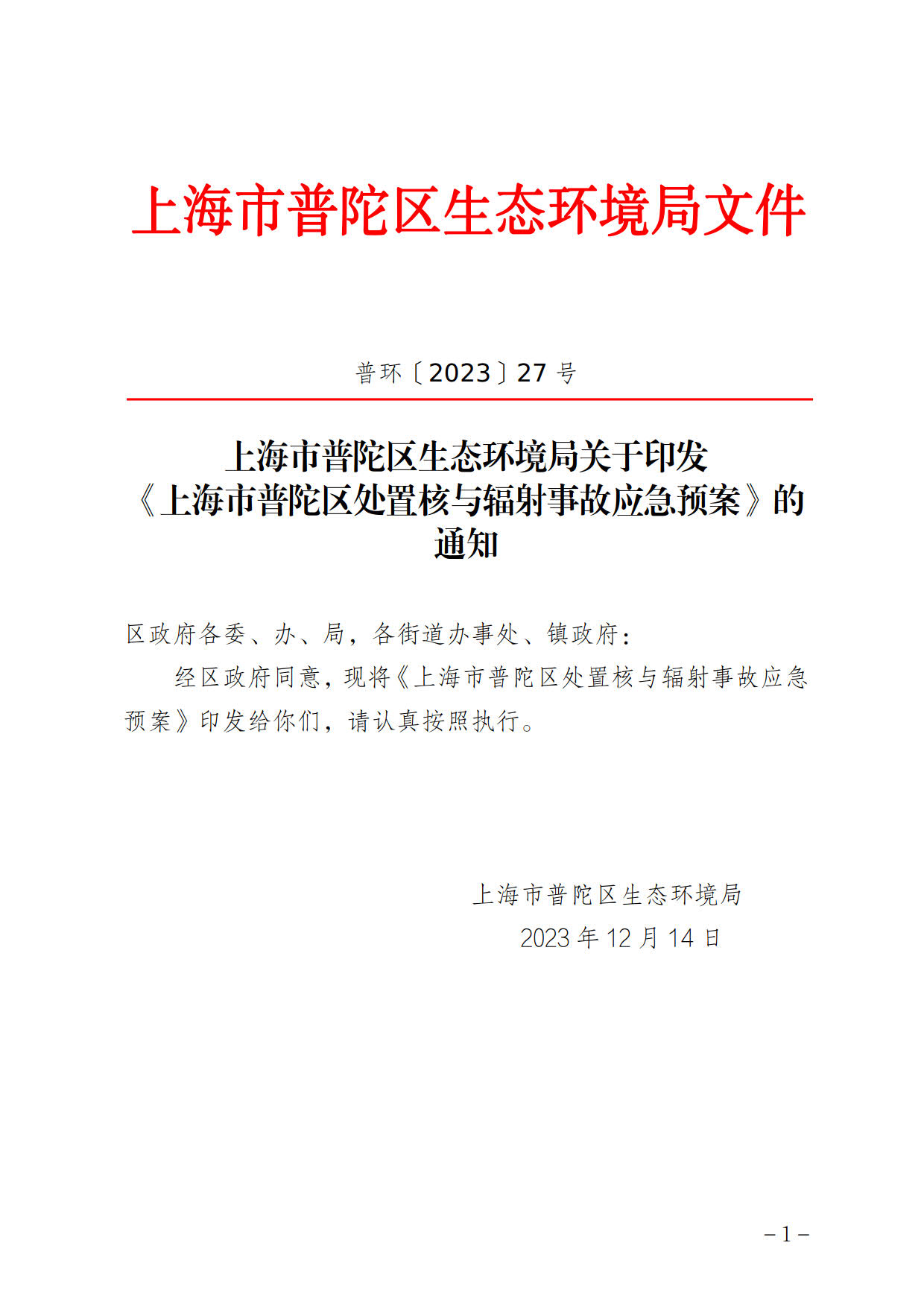 上海市普陀区生态环境局关于印发《上海市普陀区处置核与辐射事故应急预案》的通知