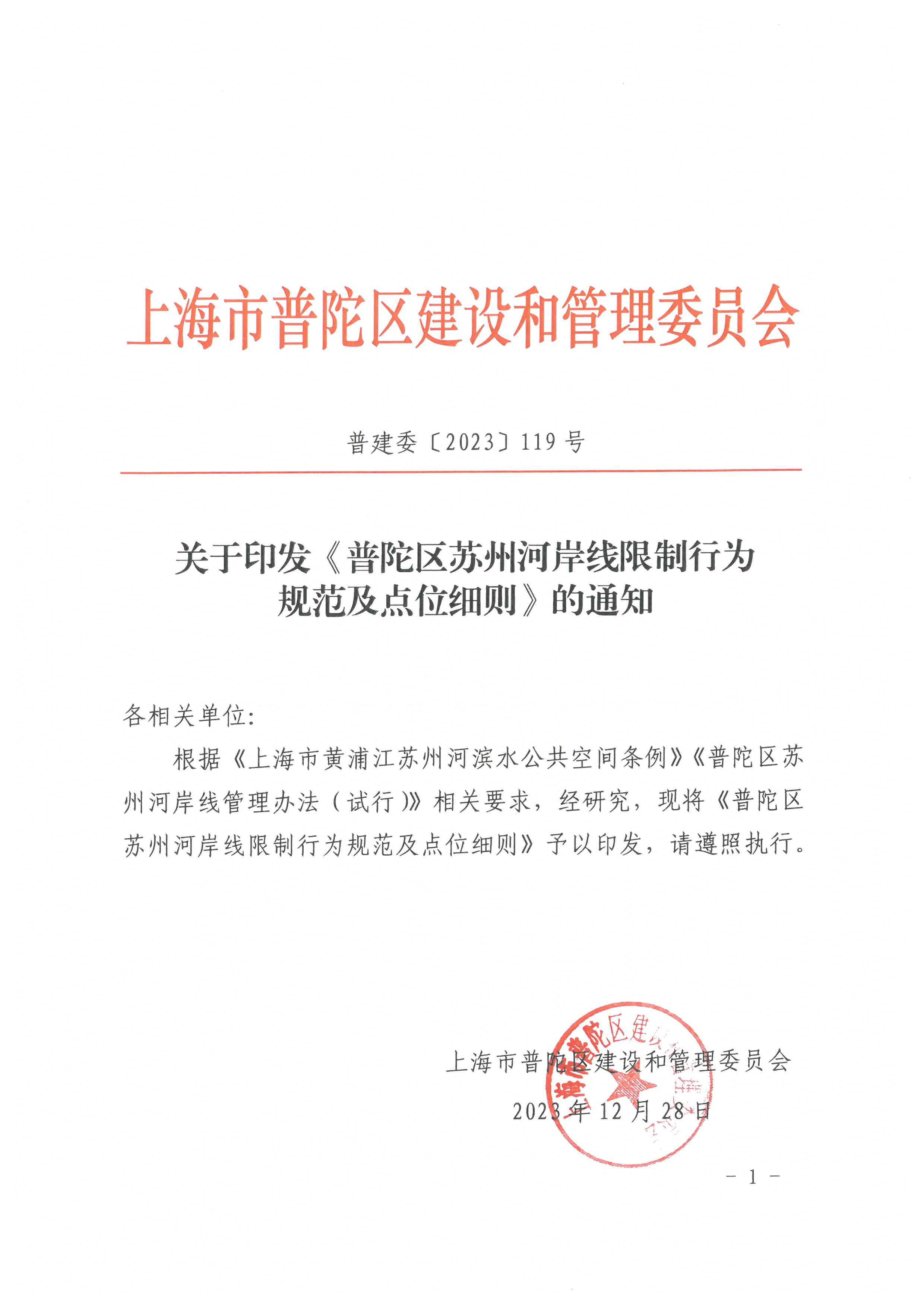 根据《上海市黄浦江苏州河滨水公共空间条例》《普陀区苏州河岸线管理办法(试行)》相关要求,经研究,现将《普陀区苏州河岸线限制行为规范及点位细则》予以印发,请遵照执行。