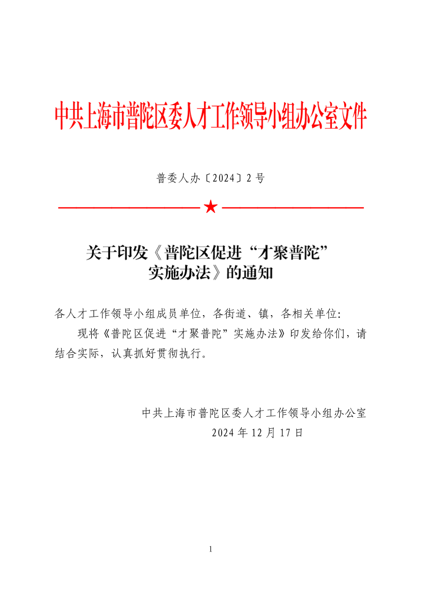 关于印发《普陀区促进“才聚普陀” 实施办法》的通知