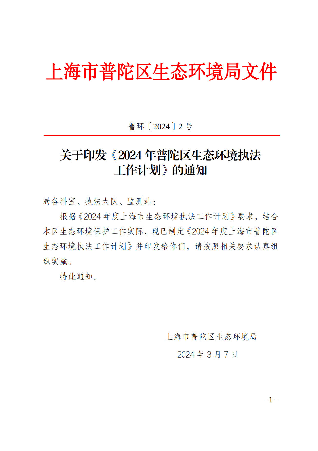 关于印发《2024年普陀区生态环境执法工作计划》的通知