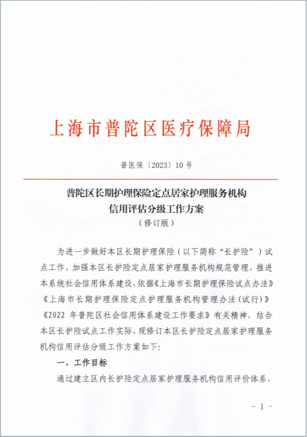 为进一步做好本区长期护理保险(以下简称“长护险”)试点工作,加强本区长护险定点居家护理服务机构规范管理,推进本系统社会信用体系建设,依据《上海市长期护理保险试点办法》《上海市长期护理保险定点护理服务机构管理办法(试行)》《2022年普陀区社会信用体系建设工作要求》有关精神,结合本区长护险试点工作实际,现修订本区长护险定点居家护理服务机构信用评估分级工作方案如下: