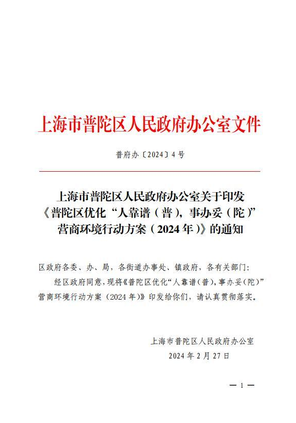 上海市普陀区人民政府办公室关于印发《普陀区优化“人靠谱(普),事办妥(陀)”营商环境行动方案(2024年)》的通知
