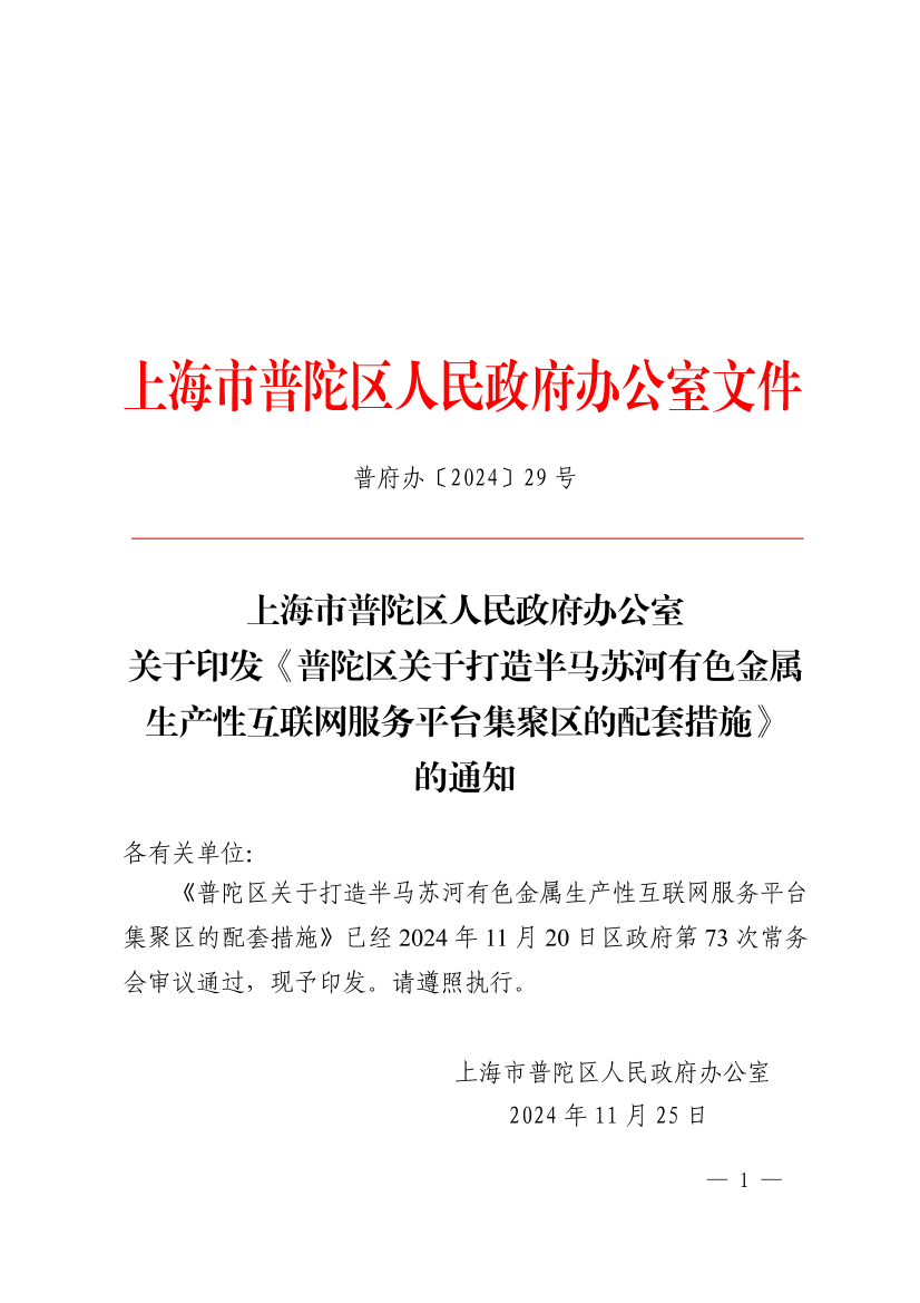 《普陀区关于打造半马苏河有色金属生产性互联网服务平台集聚区的配套措施》已经2024年11月20日区政府第73次常务会审议通过,现予印发。请遵照执行。
