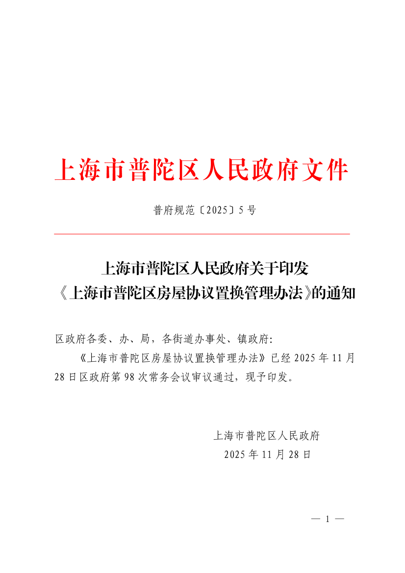 《上海市普陀区房屋协议置换管理办法》已经2025年11月28日区政府第98次常务会议审议通过,现予印发。