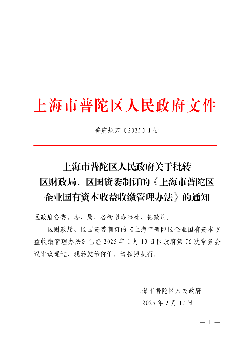 区财政局、区国资委制订的《上海市普陀区企业国有资本收益收缴管理办法》已经2025年1月13日区政府第76次常务会议审议通过,现转发给你们,请按照执行。
