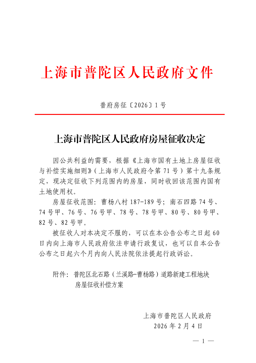 上海市普陀区人民政府房屋征收决定(普陀区北石路(兰溪路-曹杨路)道路新建工程地块)