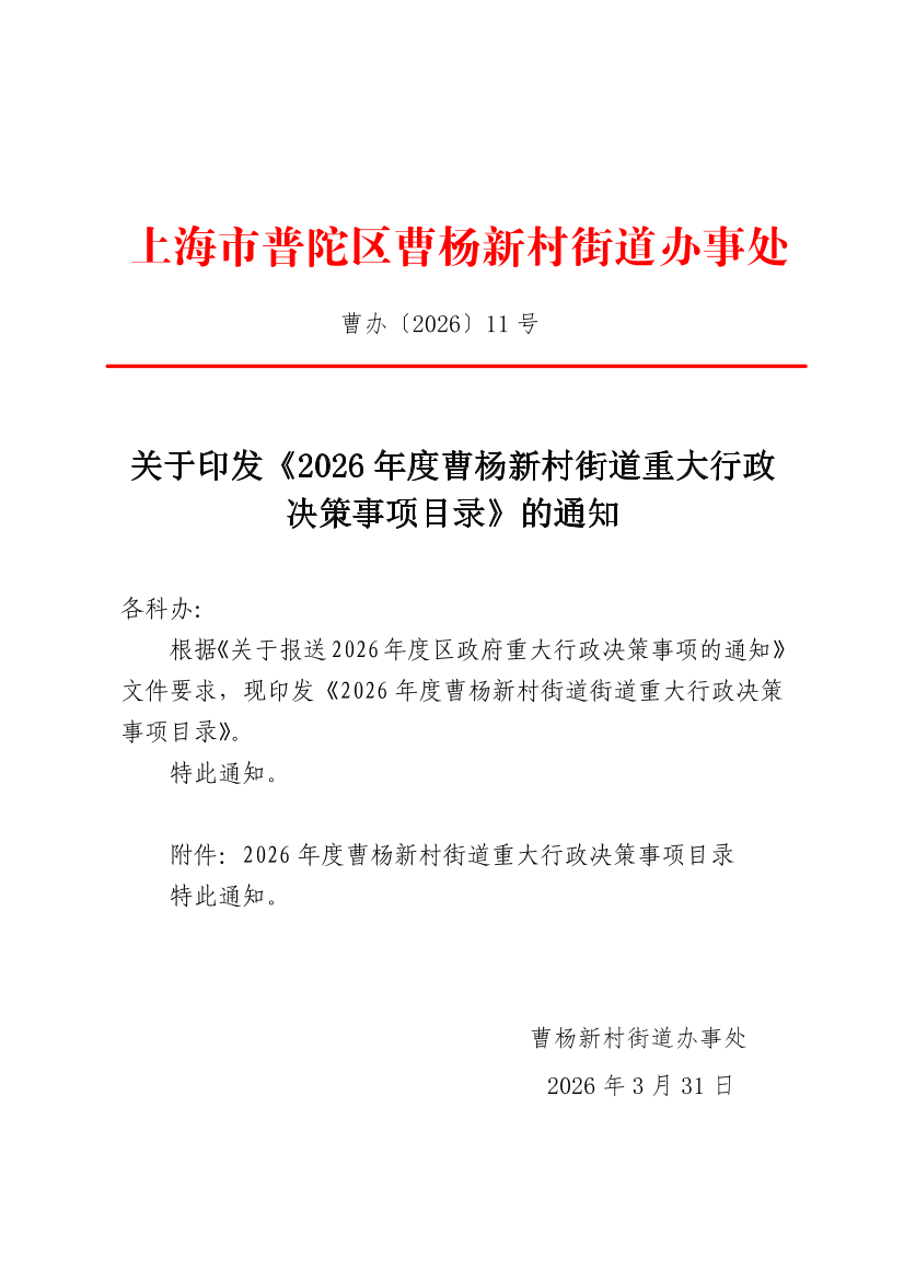 关于印发《2026年度曹杨新村街道重大行政决策事项目录》的通知