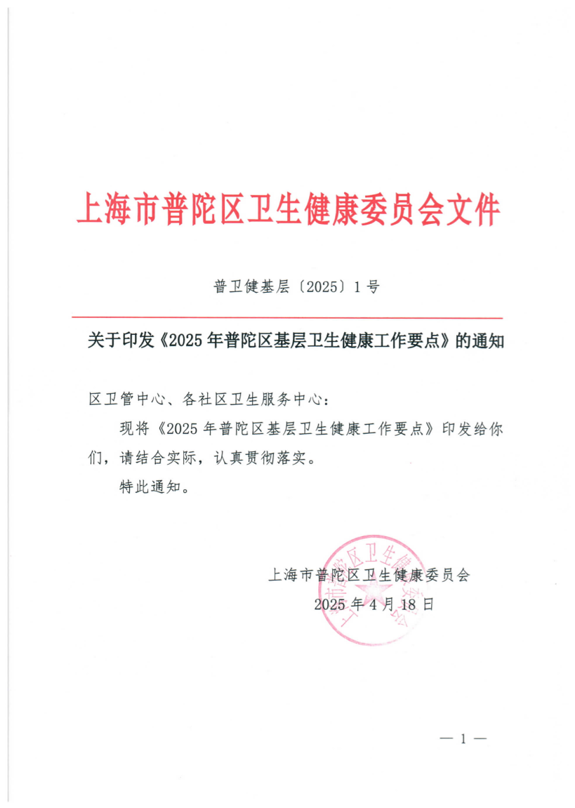 关于印发《2025年普陀区基层卫生健康工作要点》的通知