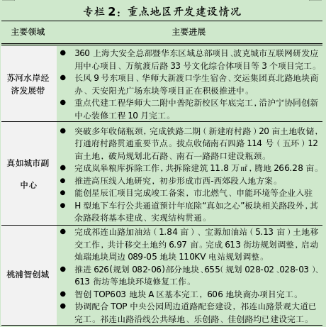 持续推动重点地区协同发展。苏河水岸经济发展带:进一步提升苏州河滨水公共空间服务功能,完成长风公园改造提升,开展“半马苏河”文化旅游节特色品牌活动。持续推进四中浇铸厂、上汽E仓等地块收储事宜,加快长风9号东项目、华东师范大学新渡口学生宿舍等4个结转项目建设。真如城市副中心:全力推进“真如之心”“真如翠谷”“兰溪路品质提升”重点项目建设进度,系统提升区域能级品质。加快中环海纳商务中心、京东上海中心项目建设,完善真如社卫中心、真如文体中心等公共服务配套。进一步推进高压走廊入地研究,努力释放土地空间。桃浦智创城:全面增强TOP中央公园品牌内涵与区域影响力,策划布局一系列文化活动。启动613生态修复项目建设,同步稳步推进073街坊景观工程建设。持续推进灿瑞芯片、绍禹科研等重点项目建设。