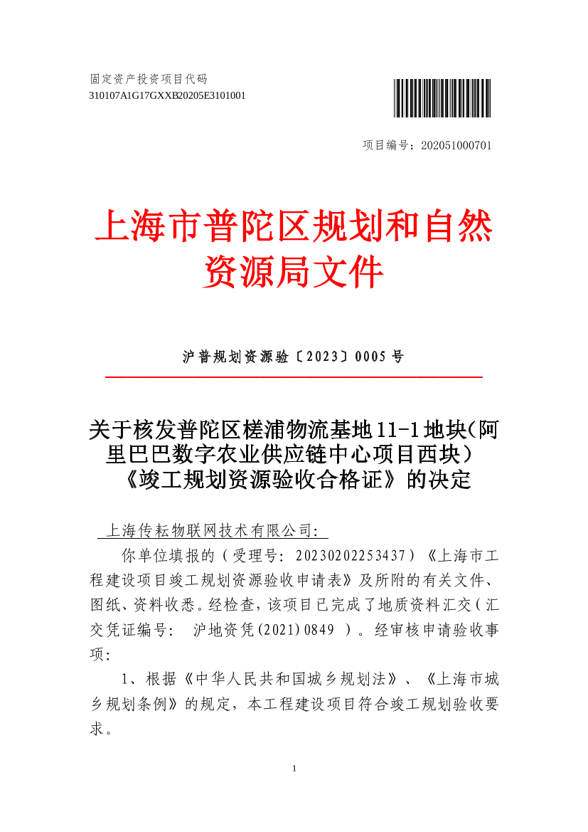 关于核发普陀区槎浦物流基地11-1地块(阿里巴巴数字农业供应链中心项目西块)《竣工规划资源验收合格证》的决定